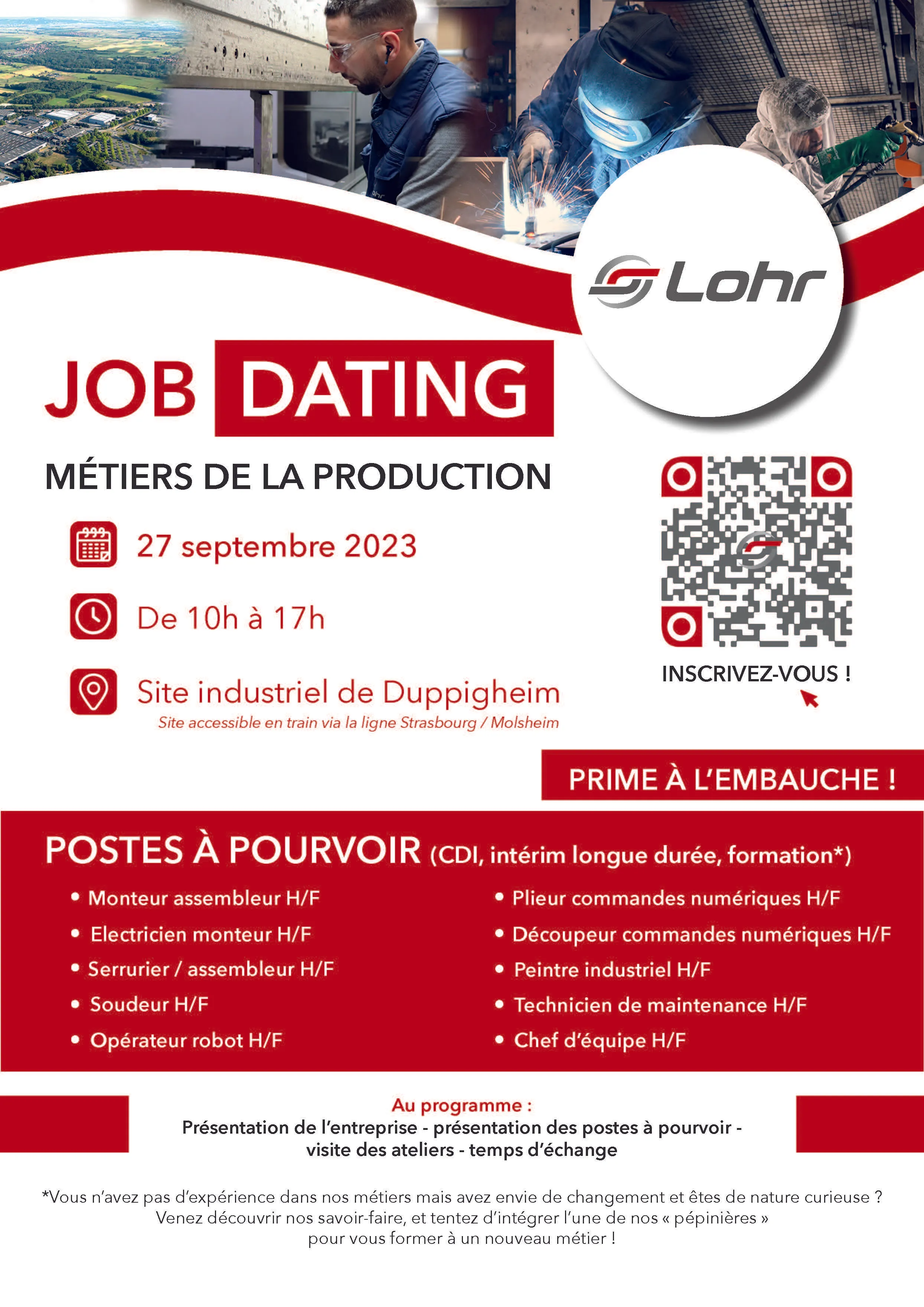 Lohr organise ce mercredi 27 septembre de 10h à 17h un job dating sur son usine de Duppigheim. Il faut s’inscrire au préalable sur le site internet de Lohr.