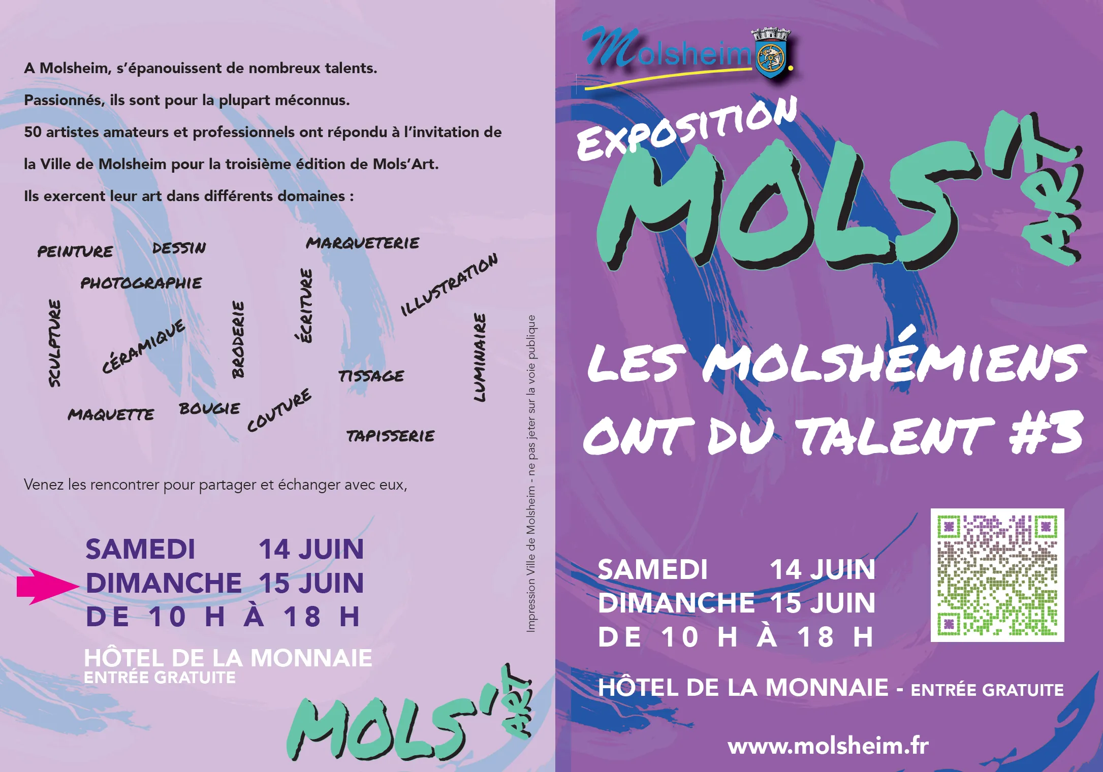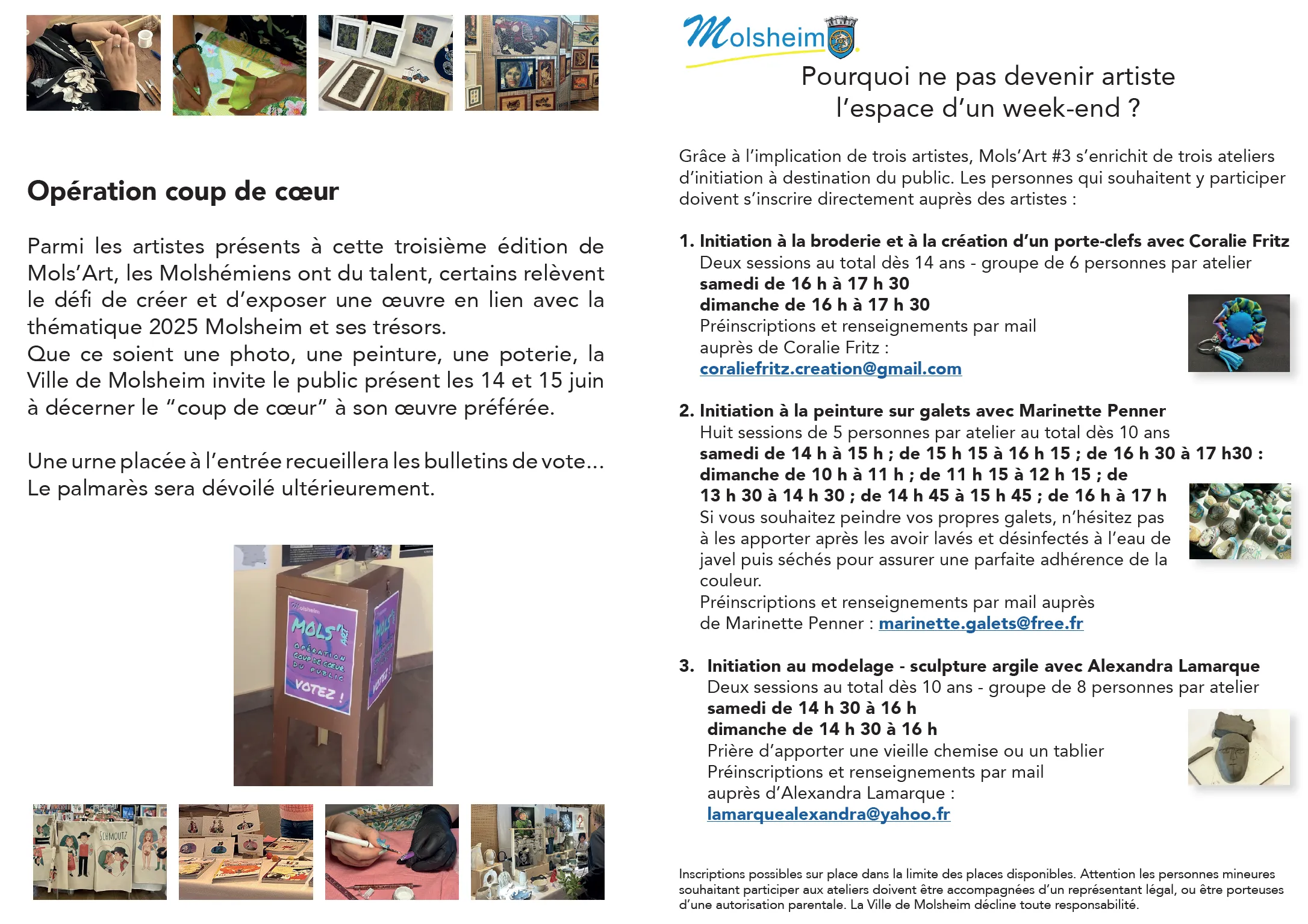 Que ce soit une photo, une peinture, une poterie, la Ville de Molsheim invite le public présent les 14 et 15 juin juin à décerner le “coup de cœur” à son œuvre préférée.