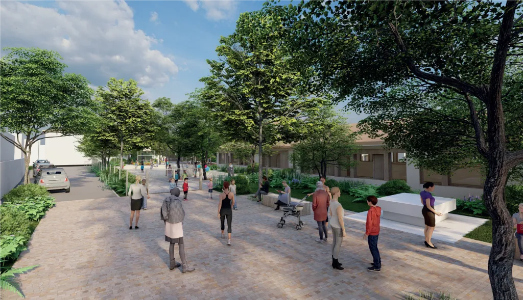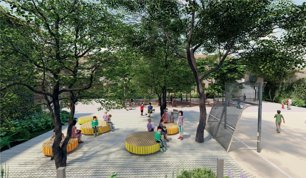 L’objectif de ce chantier est la rénovation de la cour d’école élémentaire. C’est une cour d’école qui a été construite en même temps que l’école dans les années 1960. Donc qui méritait une rénovation, notamment parce que les arbres qui avaient été plantés mourraient les uns après les autres, probablement faute d’approvisionnement en eau puisqu’il y avait du macadam à peu près partout. Donc on profite aussi de cette occasion de rénovation pour appliquer dans ce chantier des méthodes innovantes, qui sont des méthodes de désimpeméabilisation des sols, c’est-à-dire qu’on fait du zéro tuyau. Il n’y a plus de tuyaux d’évacuation des eaux de pluie. L’eau de pluie sera infiltrée directement, notamment dans les fosses des arbres qu’on va replanter. On va planter beaucoup d’arbres. C’est le troisième objectif aussi, c’est de s’adapter au réchauffement climatique. Au mois de juin, on a de la surchauffe : pas seulement dans la cour, dans l’école aussi parce que comme vous le voyez on est plein est et donc on va mettre des arbres devant la façade de l’école, de façon à apporter au mois de juin de la fraîcheur aussi à l’intérieur du bâtiment. Et bien sûr, l’objectif est aussi de faire une cour éducative qui permette aux enfants d’être proches de la nature. Il y aura des platebandes que les enfants pourront planter eux-mêmes, des petits endroits pour faire du potager, une marre pédagogique, etc.