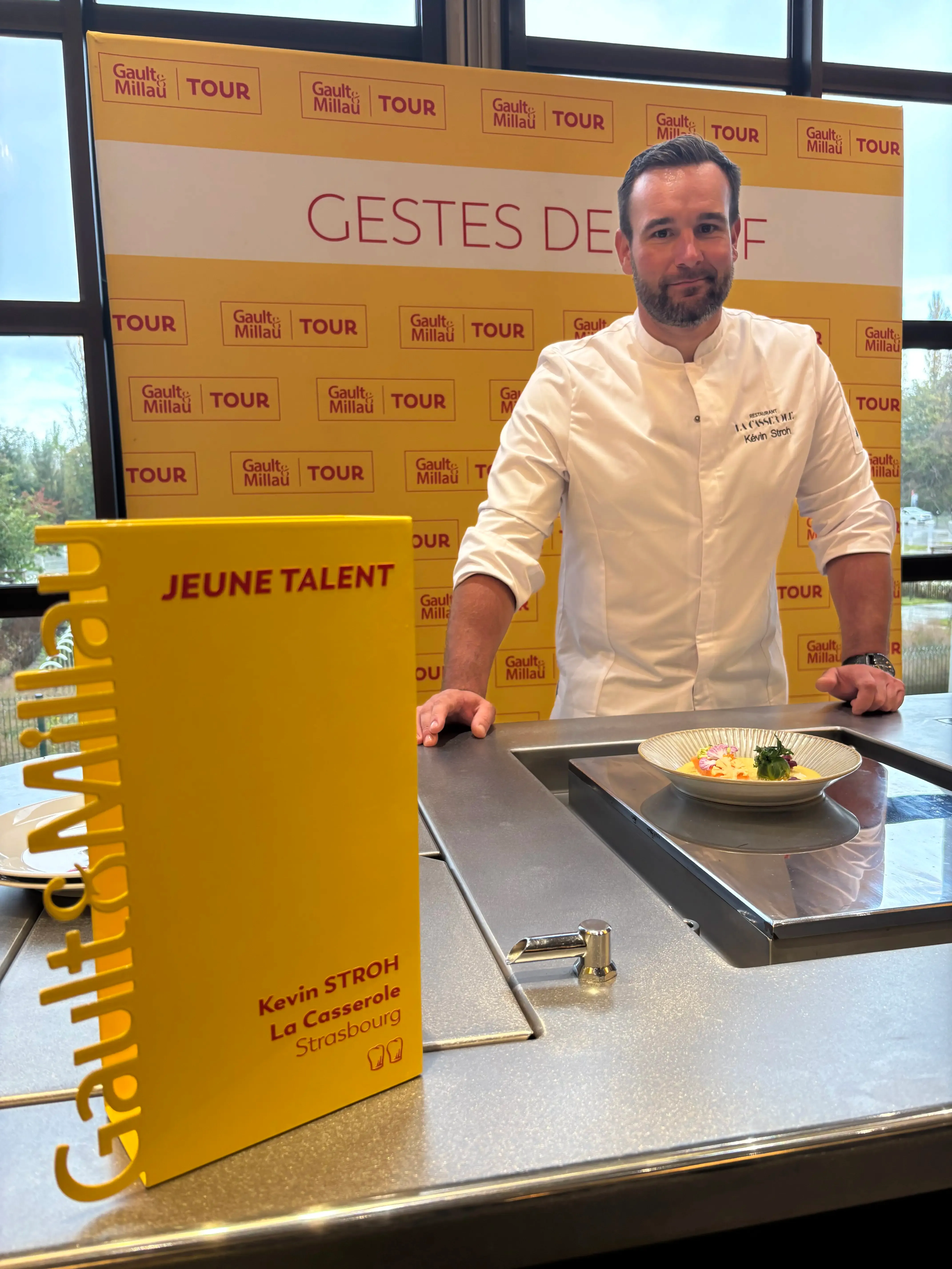 « Gault & Millau permet aussi de faire rayonner la gastronomie et les terroirs de nos régions », ajoute Marc Esquerré. Afin de donner un peu plus de sens à cet événement, le guide décerne des trophées à l’élite du milieu. Cinq sont destinés à récompenser le personnel qui travaille en salle, et six pour la cuisine. ‘’Sommelier’’, ‘’pâtissier’’, ‘’Grand de demain’’ ou encore ‘’Terroir d’exception’’, aucun métier n’est oublié. Dans le Grand Est, sur les 12 lauréats, neuf sont alsaciens. Parmi eux, le chef du restaurant La Casserole Kévin Stroh s’est vu attribuer le prix du jeune talent 2025. « C’est valorisant, c’est une récompense d’un travail qu’on a mis bout à bout pendant plusieurs mois. J’ai d’abord été étonné, puis très fier », témoigne-t-il, alors que ça ne fait que six mois qu’il a intégré les cuisines de La Casserole.