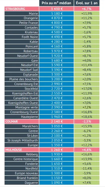 En 2022, le prix médian pour les appartements anciens est de 3 500 €/m² à Strasbourg (+6,7 % sur un an). Colmar et Mulhouse sont loin derrière, avec respectivement, 2 140 €/m² et 1 260 €/m².