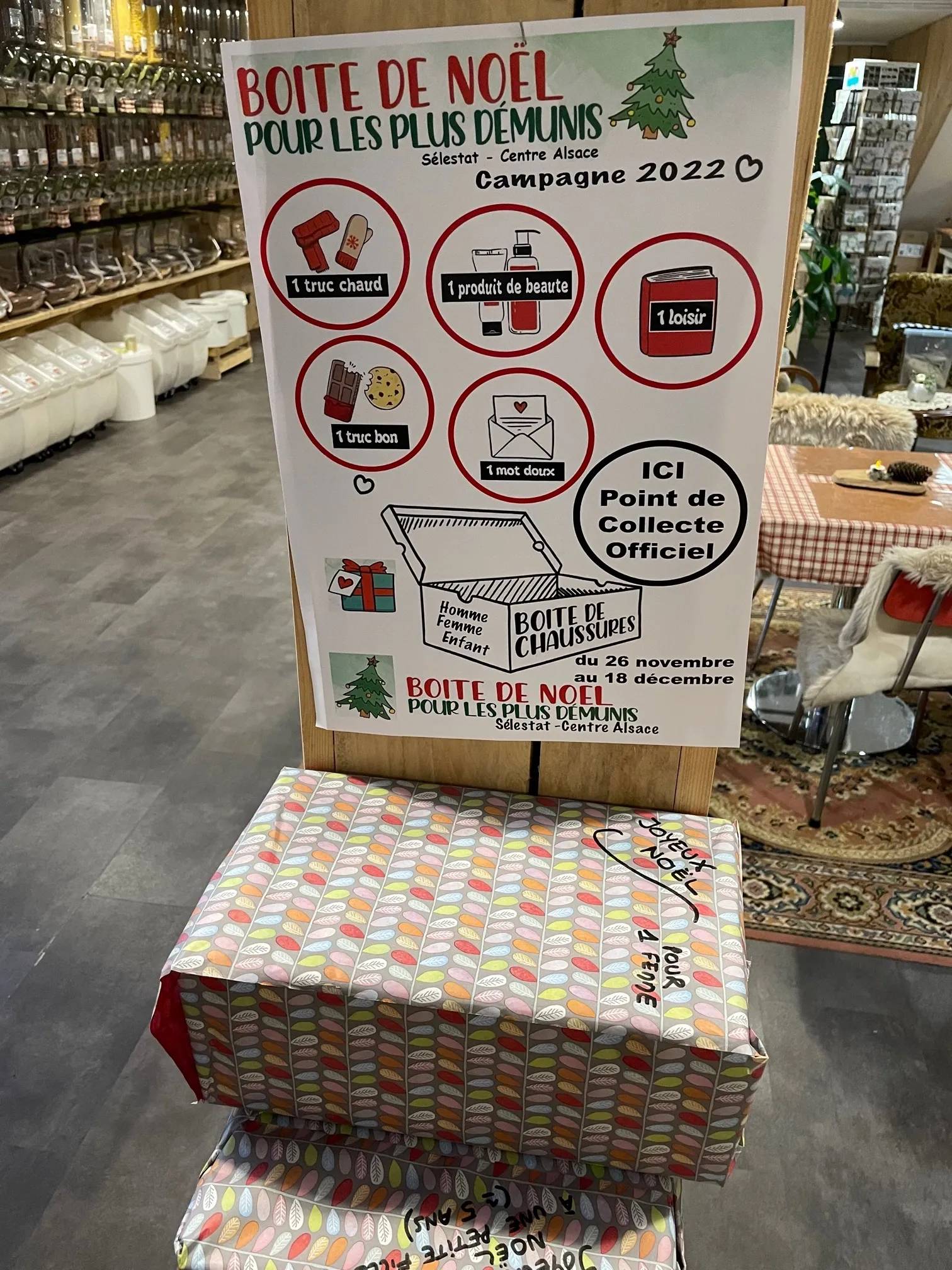 L’idée : prendre une boîte (souvent une boîte à chaussures), la décorer et la remplir de petites attentions : un “truc chaud” (gants, bonnet…), des douceurs (chocolat, bonbons), un produit d’hygiène, un loisir (jeu, livre), et un mot doux. Préparez des boites enfant, homme, femme mais aussi pour les animaux. Vos boites de Noël seront remises à des personnes en situation de précarité via des associations. Pour Noël dernier, 30 000 boites auraient été collectées dans toute l’Alsace pour l’opération « boites de Noël ».