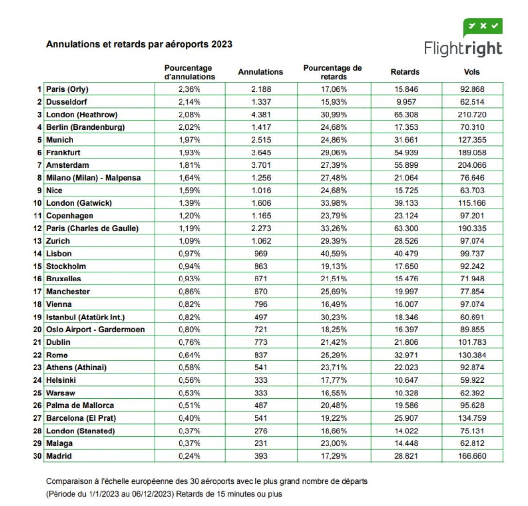 A noter que le classement a été établi sur le pourcentage de vols annulés. Mais si l'on considère uniquement les retards, le regard change puisque Lisbonne réussit à retarder 40% de ses vols ! Les aéroports de Londres (Gatwick et Heathrow) et celui de Istanbul sont à 30% ou plus. On remarquera enfin que le grand aéroport de Madrid, en Espagne, est le plus fiable : seulement 393 annulations et 17% de vols retardés sur plus de 166.000 vols (4e plus gros flux d'Europe derrière Hethrow, Amsterdam et Paris-Charles de Gaulle) en 2023. A méditer pour vos prochaines vacances...