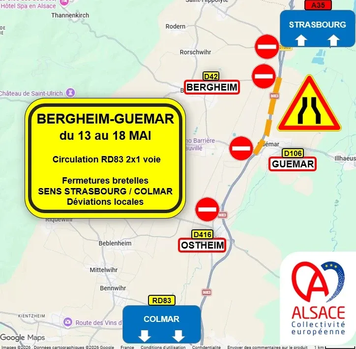 Ce chantier entrainera une circulation réduite en 2x1 voie sur la RD83 du mercredi 13 mai à minuit au lundi 18 mai à 5h et une vitesse limitée à 80 km/h, voire à 50 km/h selon les endroits. Certaines bretelles seront fermées pendant ce laps de temps uniquement dans le sens Strasbourg vers Colmar :