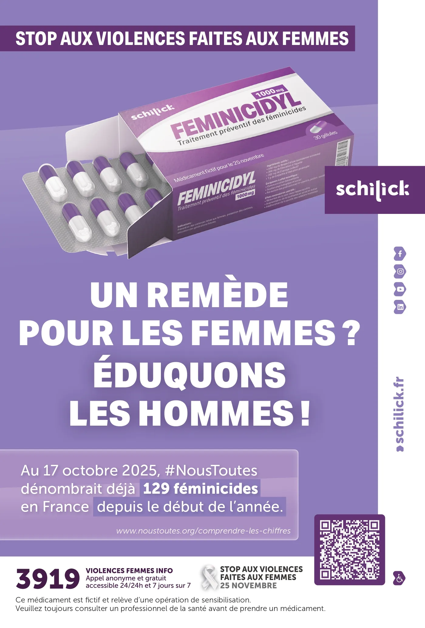 C’est la Journée internationale de lutte contre les violences faites aux femmes. Chaque année, la Ville de Schiltigheim lance une campagne d’affichage forte. Elle a décidé cette fois de mettre en scène deux médicaments factices, l’Antiviolenzine, le Feminicidyl. « L’idée est de retenir qu’il n’y a pas de remède miracle contre les violences sexuelles et sexistes, les féminicides. Par contre il y a une volonté, celle d’éduquer », lance Nathalie Jampoc-Bertrand, adjointe à la Ville de Schiltigheim. Ces affiches de sensibilisation sont visibles jusqu'à début décembre dans les rues de Schiltigheim.