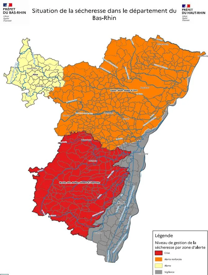 Le bassin hydrographique "Bruche, Ehn, Andlau, Giessen et Liepvrette" est placé en crise et le bassin hydrographique"Lauter, Sauer, Moder et Zorn" est placé en alerte sécheresse.