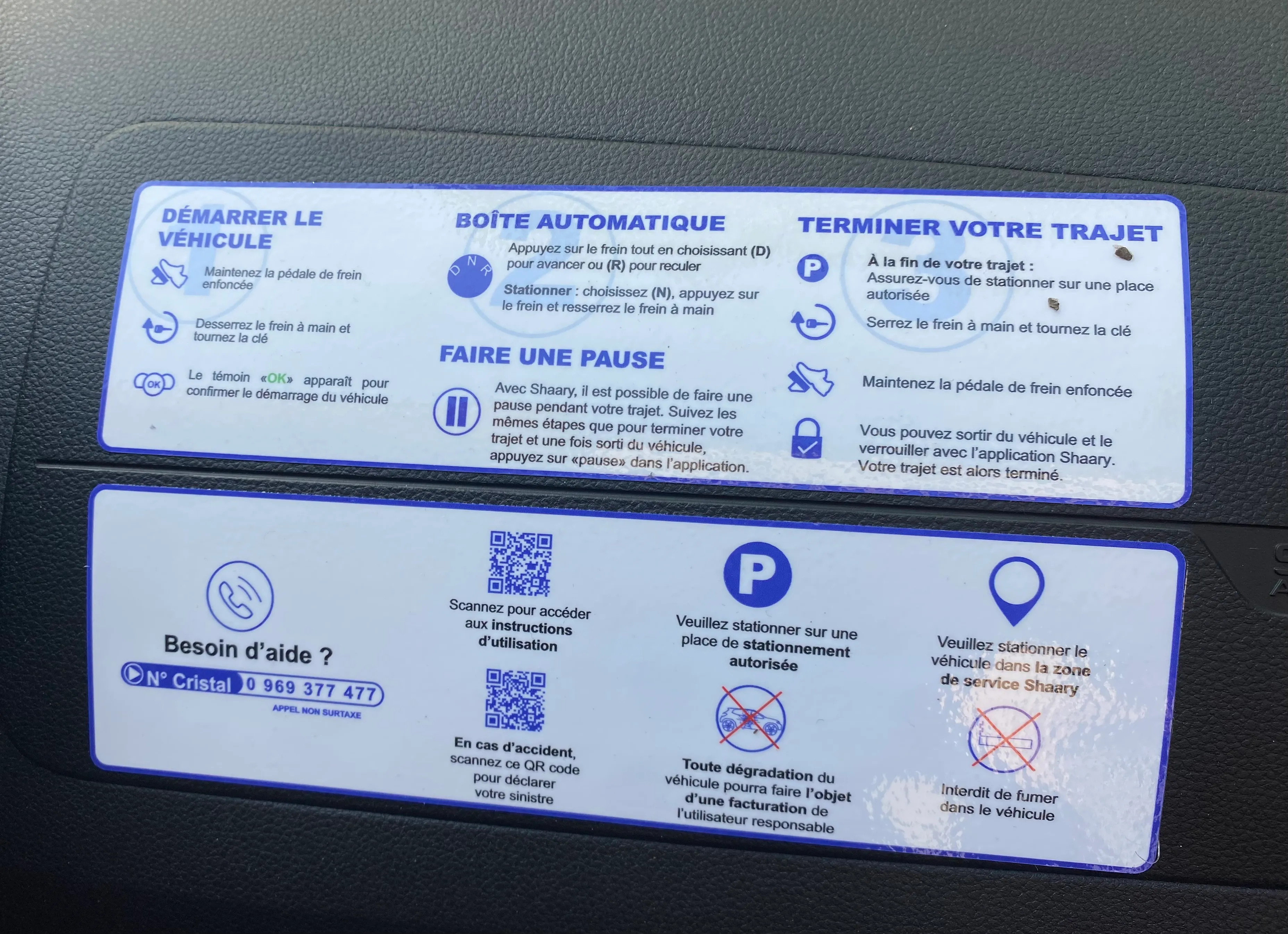 Une fois votre trajet terminé, il vous suffit de garer le véhicule dans la zone prévue par Shaary. A noter que la zone Grande Île autorise seulement le stationnement en pause, et non la fin d’une course.