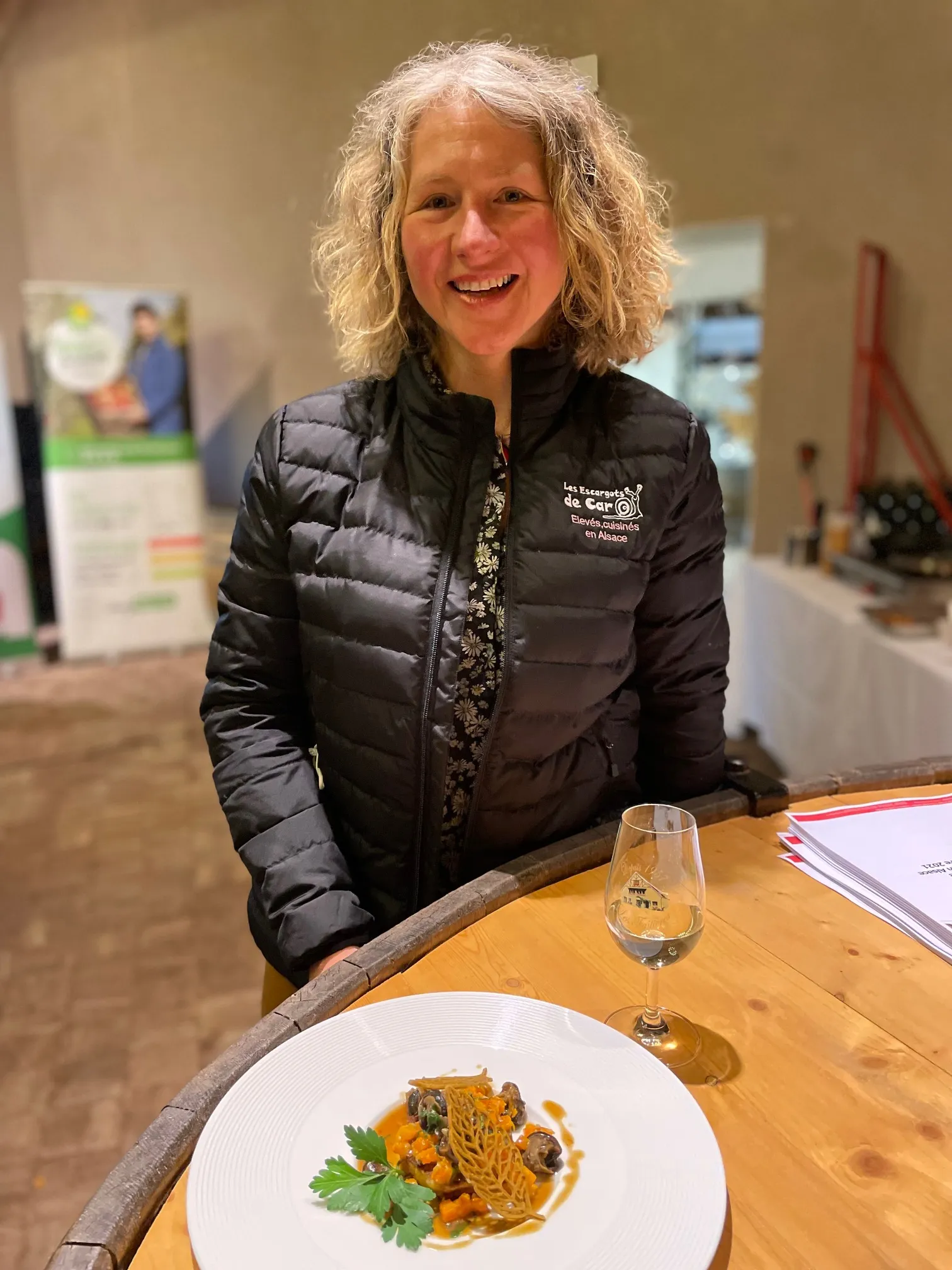 Le chef a utilisé des escargots alsaciens, d’Ostheim. Ils sont élevés et transformés par Carole Konradt, qui cette année a mis 400 000 escargots en parc sur 1 500 m2. Les escargots sont un vrai produit festif : Carole en vend la moitié de sa production au mois de décembre.