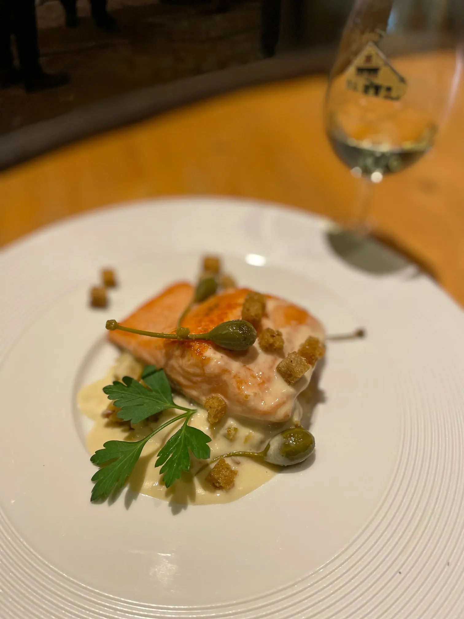 Pour continuer, le chef Jean-Christophe Karleskind propose une truite saumonée sur un lit de choux vert, lard paysan et compotée de carottes, avec un peu de raifort d’Alsace, des croutons et des câpres ( (à déguster par exemple - avec modération - avec un Riesling Grand Cru Praelatenberg de la Cave Les Faitières d’Orschwiller).
