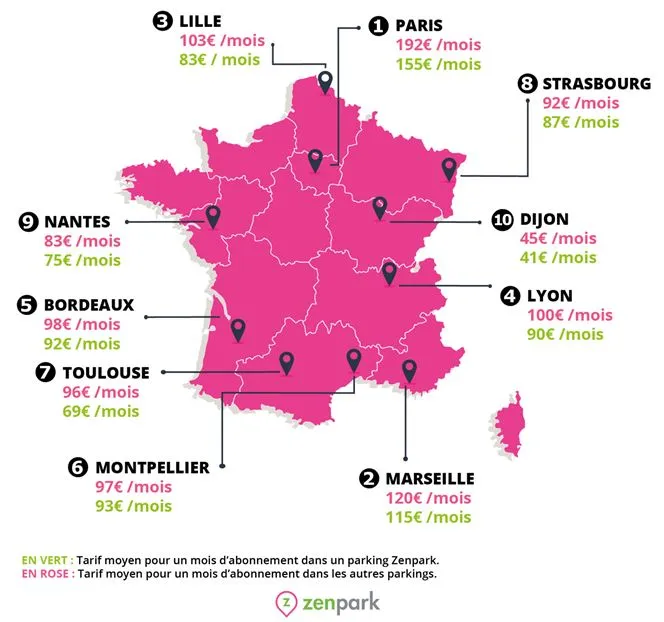 Zenpark a analysé un peu plus de 12 000 places de parkings sécurisées disponibles à la location sur notre plateforme ainsi qu’un relevé des tarifs dans la plupart des parkings publics et privés de chaque ville disponibles sur internet. En moyenne, le coût de la location dans un parking public en France est de 132,97€ tandis que la mensualité pour un parking privé souterrain est de 96,78 €, soit une différence de plus de 27%.