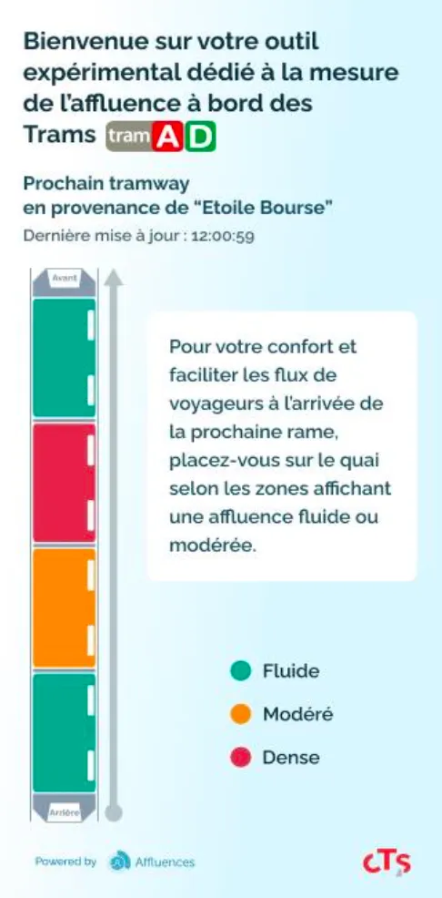 Une simple caméra disposée au bout de l’arrêt « Étoile-Bourse » permet de mesure l’affluence en temps réel pour les usagers de la station « Porte de l’Hôpital ». En scannant un QR code affiché à cette station, les usagers des lignes de trams A et D sont redirigés vers une page dédiée de la CTS. Ils y découvrent alors l’affluence de la prochaine rame dans laquelle ils monteront à bord.