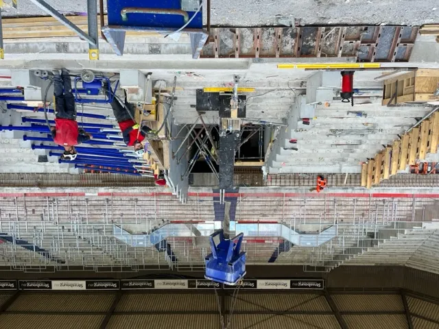 Les ouvriers en train de travailler sur la tribune ouest du stade
