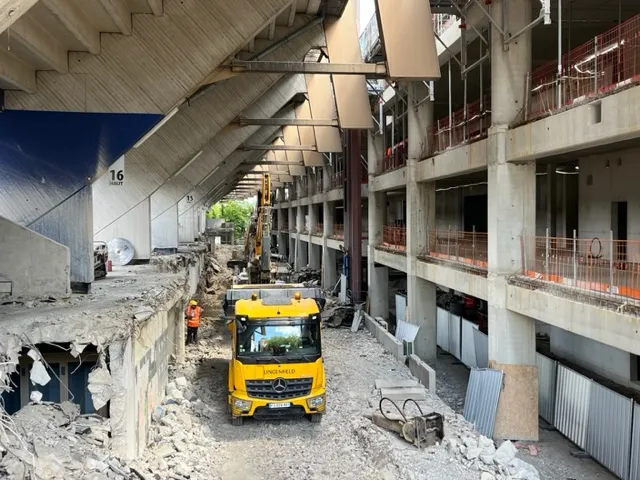 3000 m3 de béton sont démolis et évacués sous les tribunes du stade.