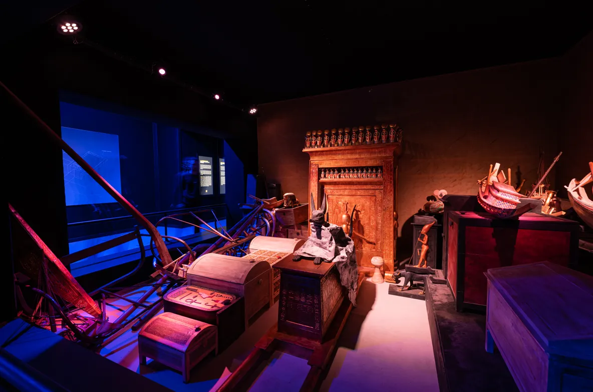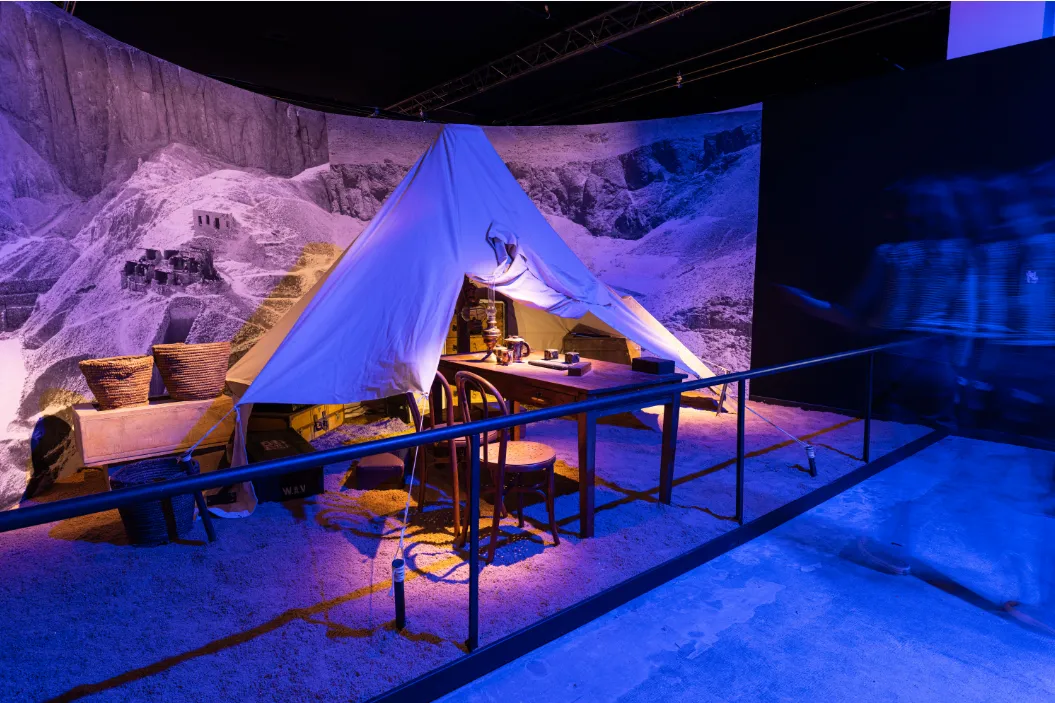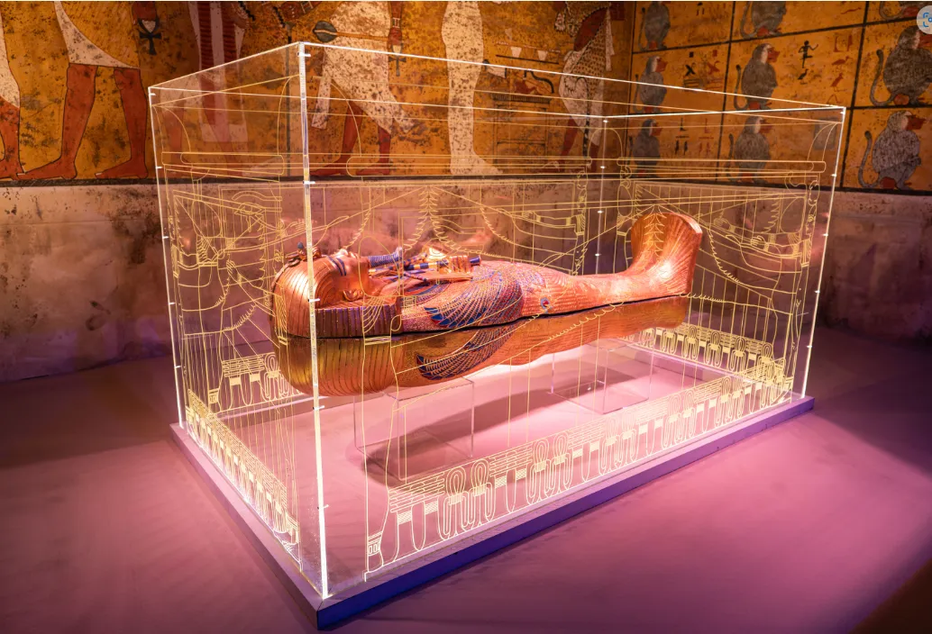 Les visiteurs vont traverser une succession de pièces de reconstitution, et seront transportés dans la magie et le mystère de l'Egypte ancienne. Ces salles ont été recréées en Egypte même, par le Supreme Council of Antiquities Replica Production Unit. Le public va s'immerger dans la vie quotidienne des Egyptiens il y a 3 300 ans, avec ses cultes funéraires, et ses rites à la cour du pharaon. Rien n'est laissé au hasard pour plonger les visiteurs dans l'antiquité égyptienne : des produits utilisés pour les peintures murales jusqu’aux moisissures constellant les murs de la tombe, en passant par les procédés d’écriture utilisés en Égypte il y a 33 siècles, aucun détail n’a été négligé !