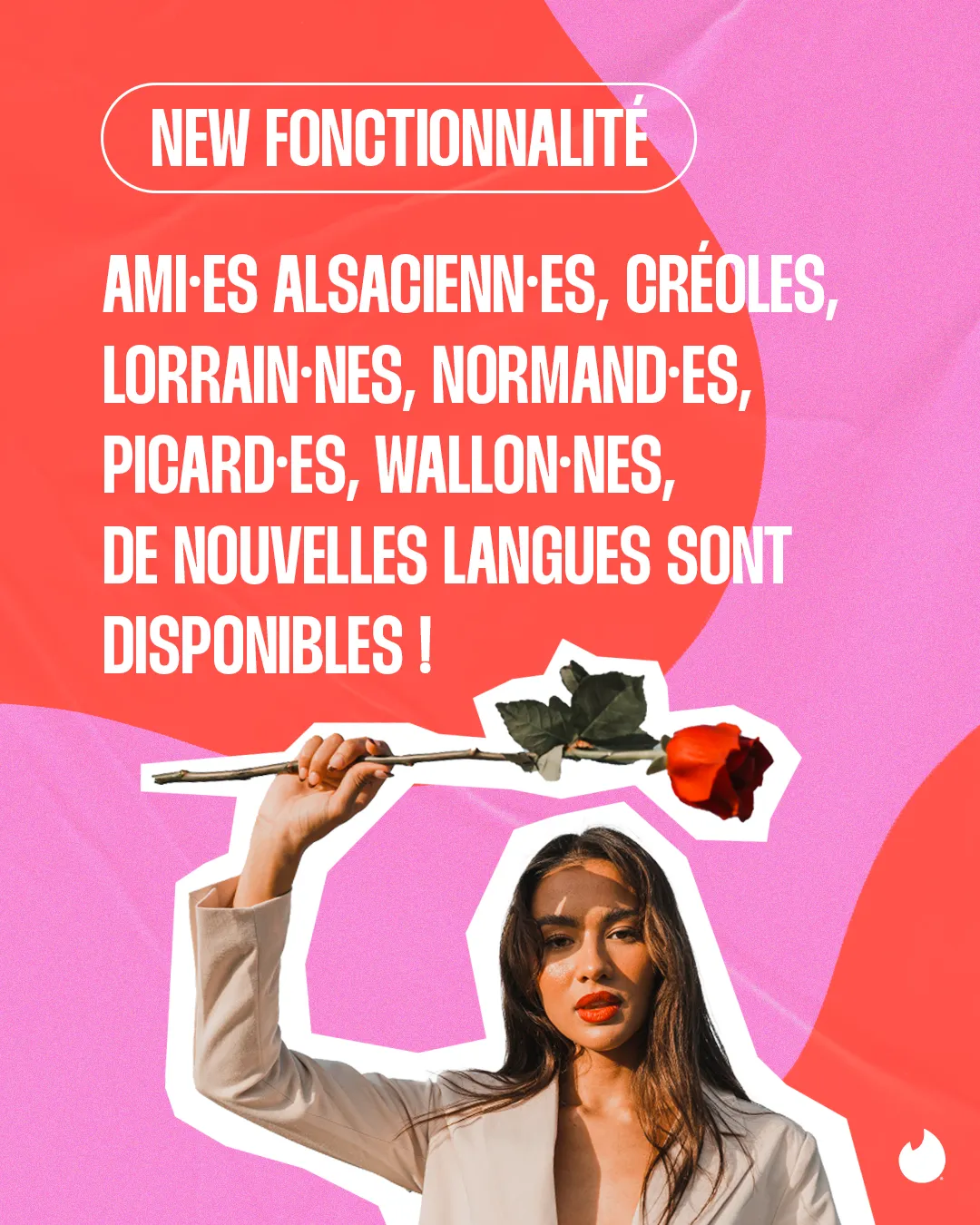 Tinder a annoncé, le 3 mai dernier, l’ajout de plusieurs langues régionales sur son application. Le normand, le lorrain, le créole, le flamand, le wallon ou encore le picard qui rejoignent le breton et le basque. Une nouveauté qui permet de cibler davantage ses recherches ou même de se démarquer.