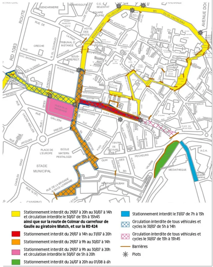 Concernant les conditions de stationnement et de circulation, de nombreuses restrictions sont à prévoir à Sélestat dès le vendredi 29 juillet. Voici les prévisions ci dessous :
