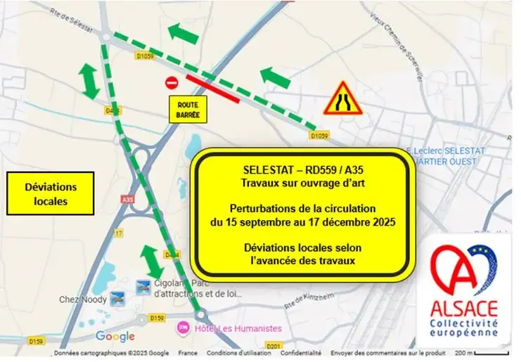 Des travaux (entretien, remplacement de grandes corps, renforcement de la structure des trottoirs…) vont avoir lieu sur le pont de la RD559, entre Sélestat et Châtenois. Il s’agit du pont franchissant l’A35. A partir du lundi 15 septembre à 8h et jusqu’au mercredi 17 décembre, vous devrez faire attention sur cette portion de route, limitée à 50km/h pendant toute la durée du chantier.