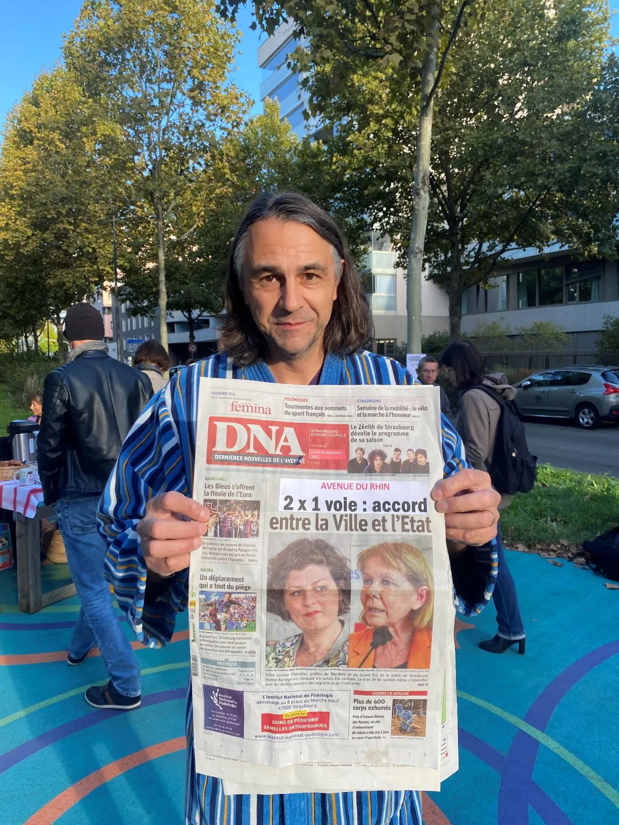 "Il est temps de rendre la circulation compatible avec la vie humaine autour" déclare Céline Dupeux, membre du collectif citoyen "Ré_inventons l'Avenue_du_Rhin". Les membres du collectif citoyen habillés en pyjama ont pris leur petit déjeuner ce matin sur le terre-plein central de l'avenue du Rhin. Il ne s'agissait pas d'une manifestation mais d'une "mise en scène ironique du quotidien des riverains dans cet environnement redoutable" précise Céline Dupeux. Le collectif déplore l'annulation par la ville de Strasbourg de la Journée sans voiture qui était prévue initialement ce dimanche 18 septembre.