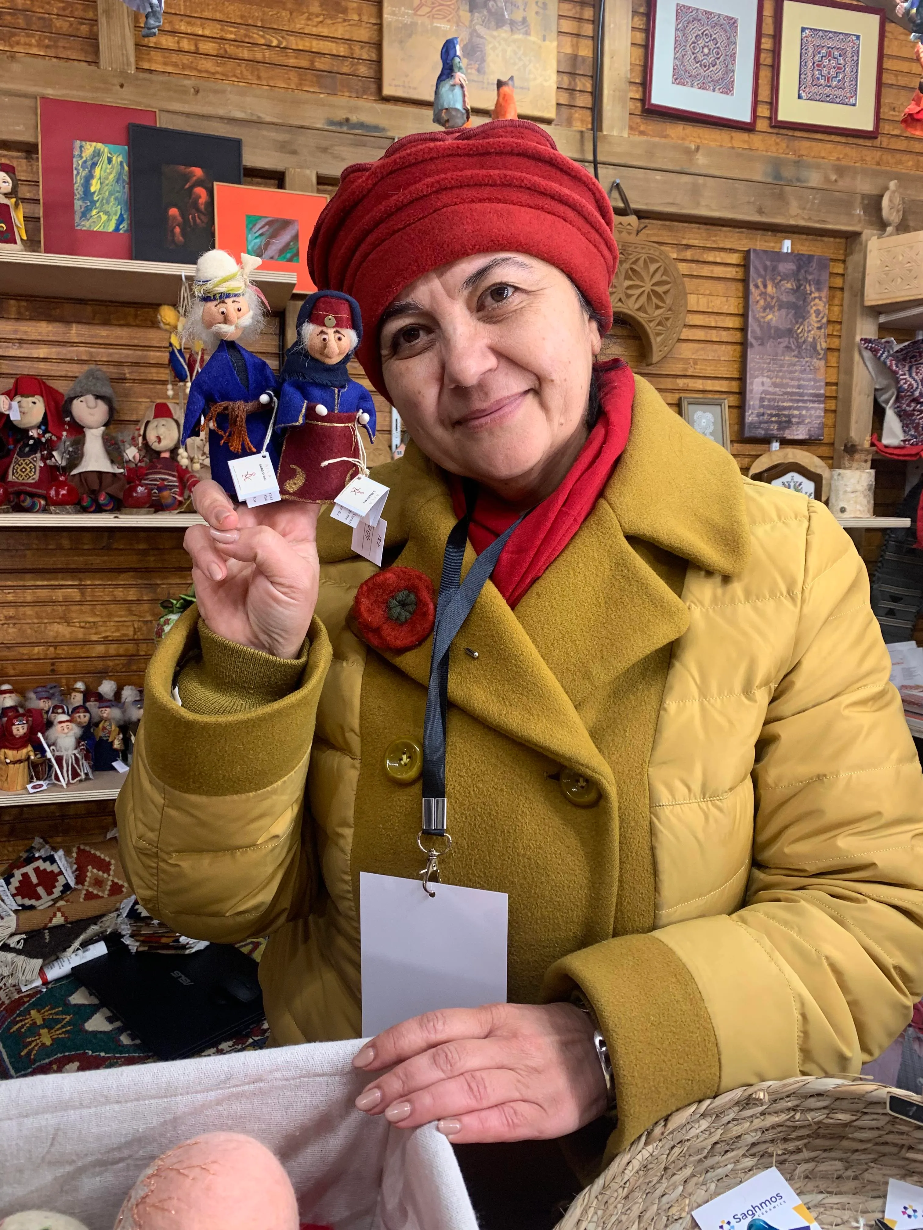 Dans le chalet, une soixantaine de maîtres artisans sont représentés et plus de 1 000 œuvres artisanales sont présentées. Les traditions arméniennes sont à l’honneur sur les étales de ce stand : des Garant Baba en laine, père Noël typique du pays, des salières en bois en forme d’oiseau et gravées de motifs arméniens, mais aussi des amulettes, des broderies et autres travaux en bois. “On a de la broderie avec la technique de Svaz qui est typiquement arménienne", explique Meri. Le produit qui se vend le mieux sont les boules de Noël réalisées avec une technique typique, blanches avec de magnifiques motifs : “C’est un symbole arménien”, précise l'étudiante avant d’ajouter : “la tradition veut que l’on mette les boules de Noël sur l’arbre de la vie, que l’on décore aussi avec des figues colorées et des fruits secs”. Le stand attire nombre de touristes, car la culture arménienne “est unique, donc notre stand est différent des autres”.