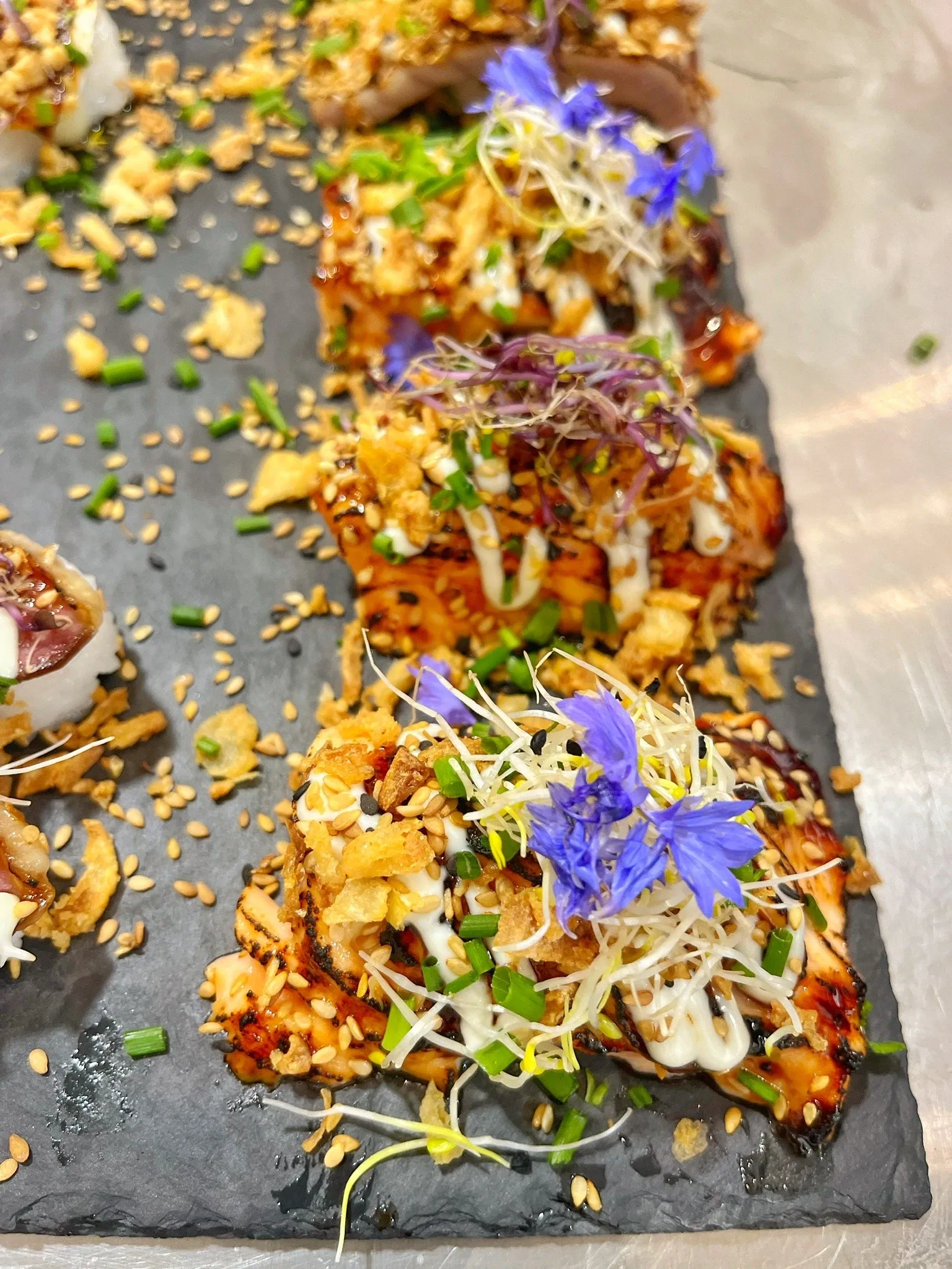 C’est en Thaïlande, où il a vécu plusieurs années, que Marvin Gül a découvert le « Sushi burn ». Les sushis sont flambés et c’est surtout la marinade qui va donner le goût au plat. Une marinade dont la recette est bien sûr tenue secrète mais qui vient directement de Thaïlande (tout comme les topping et les boissons aux pulpes de fruits) ! Marvin Gül ne travaille que des produits frais, pas de poissons congelés, tout est fait minute. Et ses recettes permettent au saumon, au thon, aux crevettes, au boeuf d’avoir une toute autre saveur. D’ailleurs pour les fêtes de fin d’année, un sushi à la raclette sera proposé, avec boeuf et raclette fumée fondue. En dessert, il y a aussi le sushi figues mielleuses et chèvre fondante ! « On fait des recettes traditionnelles retravaillées », explique Marvin Gül.
