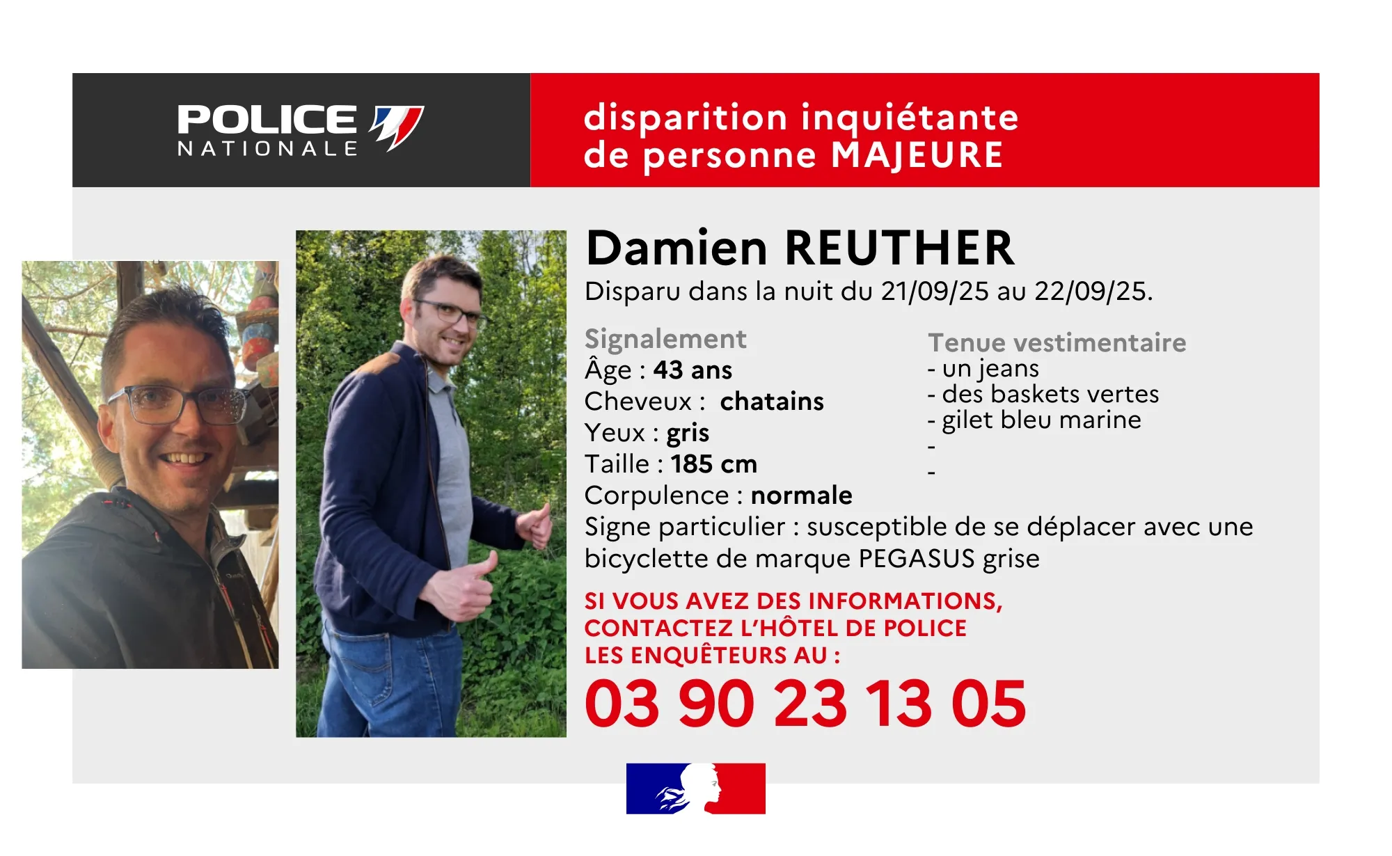 Qu’est-il arrivé à Damien Reuther ? L’homme de 43 ans a quitté son domicile situé à Hoenheim dans la nuit du dimanche 21 au lundi 22 septembre. La police nationale lance à présent un appel à témoins car cette disparition se fait « dans des circonstances particulièrement inquiétantes » d’après le forces de l’ordre. Si vous avez des informations au sujet de cette disparition, appelez le 03 90 23 13 05.