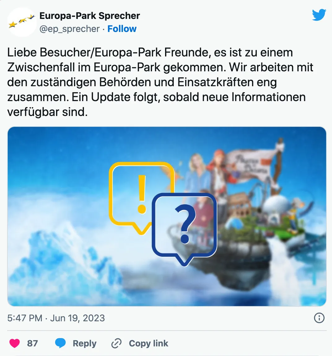Sur Twitter, Europa-Park a communiqué à 17h45 : "Chers visiteurs. Il y a eu un incident à Europa-Park. Nous travaillons en étroite collaboration avec les autorités compétentes et les secours. De nouvelles informations vous seront communiquées dès que de disponibles".