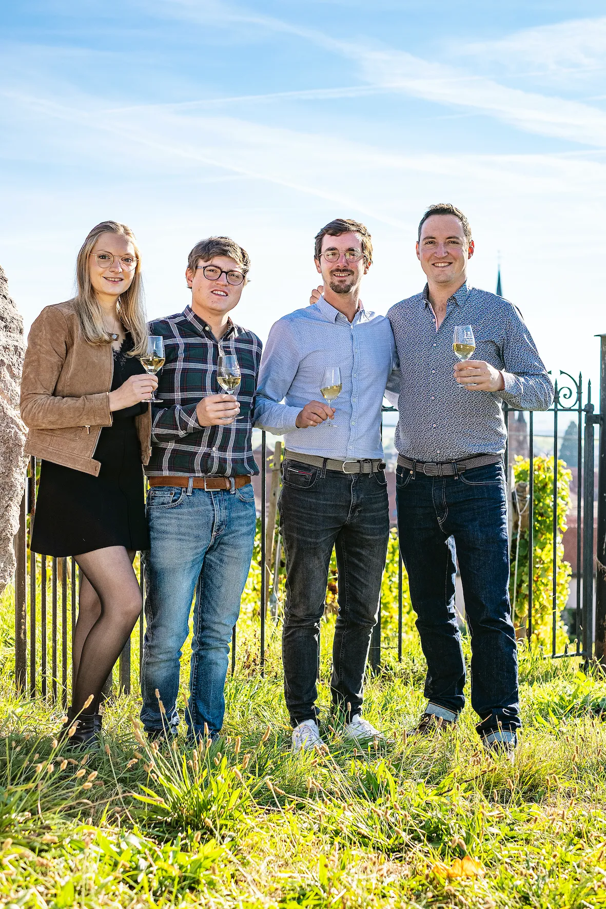 La famille Ruhlmann-Schutz possède ses vignes à Dambach-la-Ville depuis 1688 et produit des vins en son nom propre depuis trois générations. Louise-Anne, Jacques-Emile, Thomas et Antoine, un quatuor de cousins-cousines, se sont associés pour reprendre le domaine familial, ici en Alsace, mais aussi dans le Languedoc. C’est une particularité rare chez nous : les viticulteurs avec une double casquette régionale se comptent sur les doigts d’une main en Alsace.