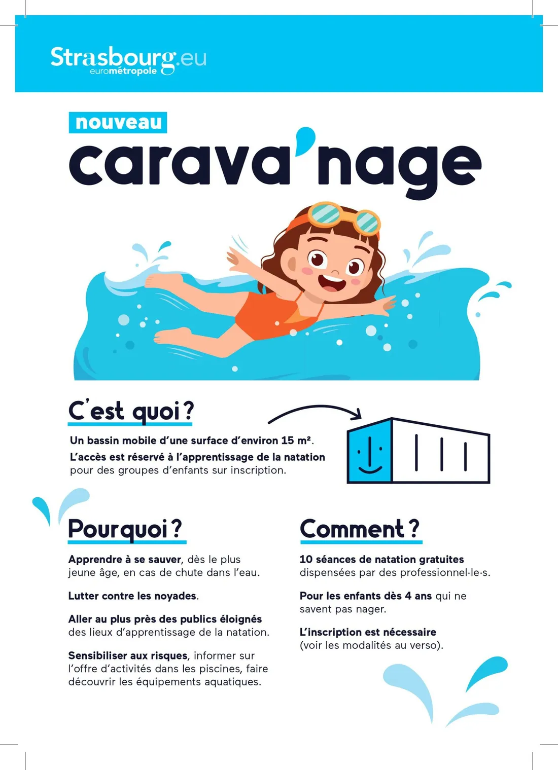 A la rentrée de septembre, ce projet pédagogique sera complété par une offre d’éveil aquatique destinée aux 4-6 ans dans toutes les piscines couvertes de l’Eurométropole.