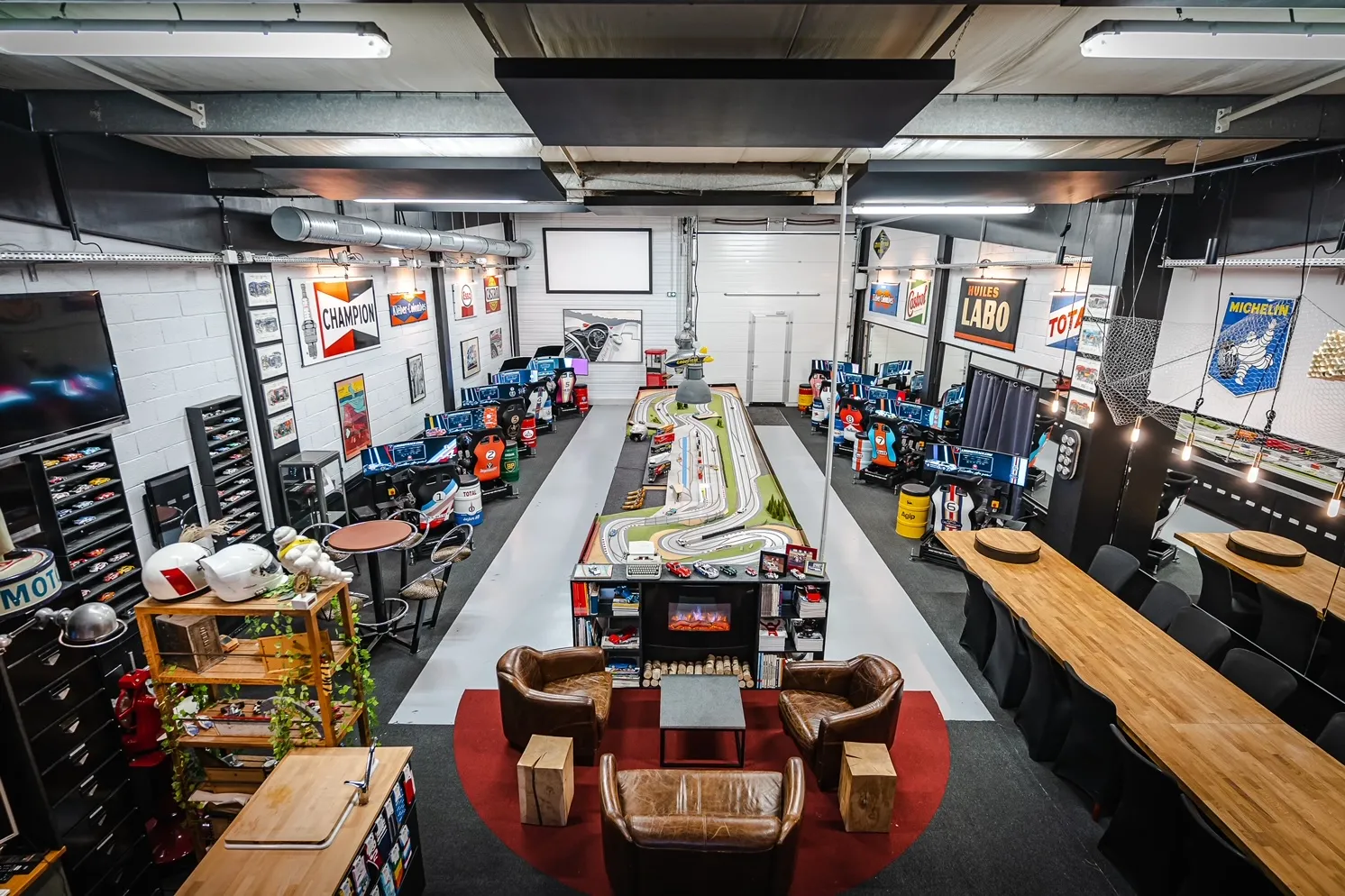Alors derrière vous, vous avez une piste de Slot Racing, c’est une piste en bois de petites voitures, un peu comme nos Scalextric de l’époque où vous pouvez rouler avec huit petites voitures et des manettes, pour faire des courses d’endurance, comme sur Simracing, mais cette fois on est debout, on a huit équipes, avec cinq pilotes qui se relayent et qui roulent comme dans leur enfance.