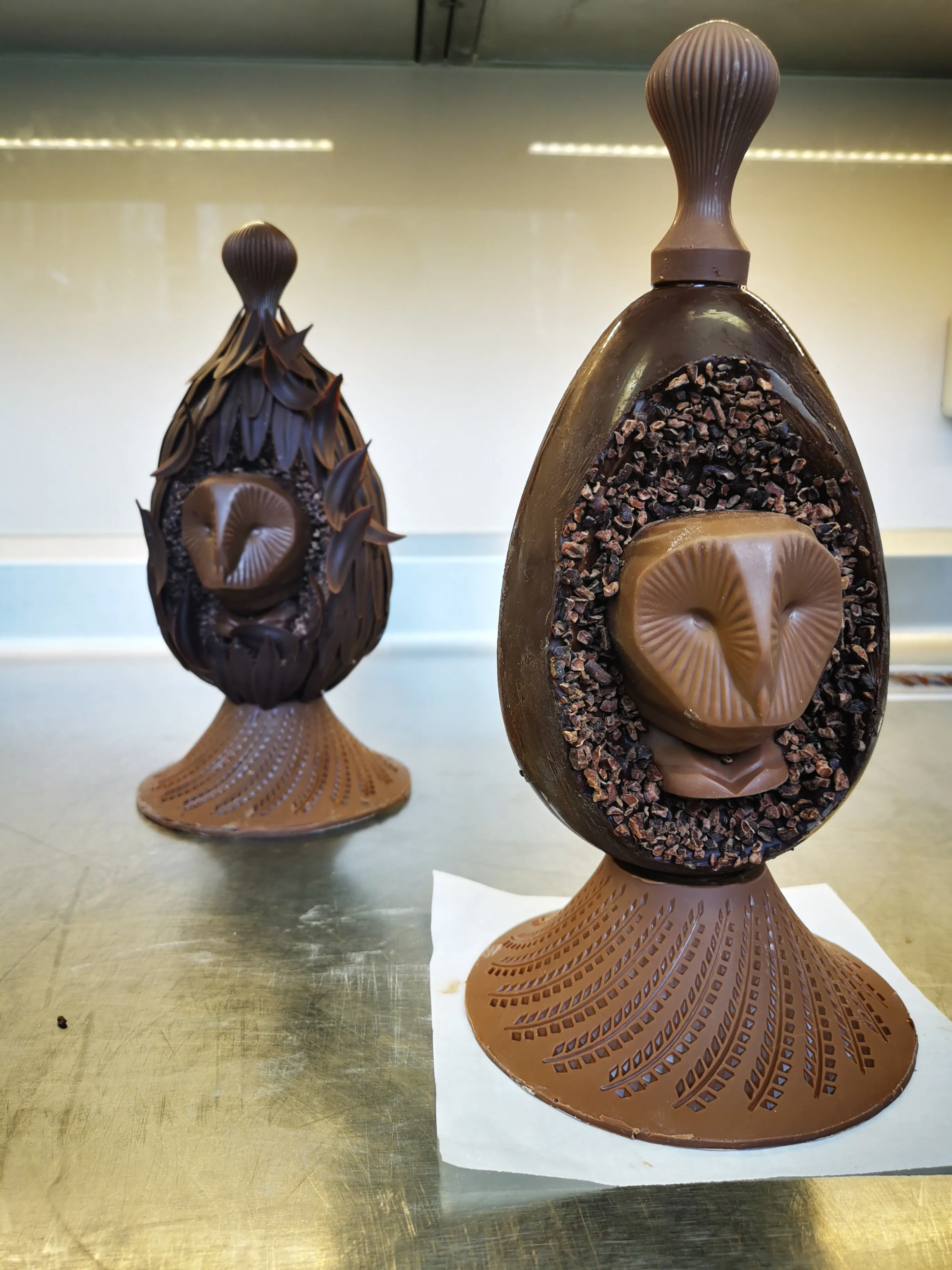 Pour cet oeuf "chouette", les problèmes ont commencé quand il a fallu réfléchir à comment le réaliser. "C'est pas toujours évident, il faut réfléchir et rebondir assez rapidement. Le plus compliqué c'était le rendu des plumes, et tout doit être parfait tout de suite puisqu'on ne rajoute pas de beurre de cacao par exemple. Il y a eu quelques essais pour trouver le bon galbe, la bonne taille, les bonnes proportions... Maintenant, on est en phase de production à plus grande échelle. On a fait 5 000 plumes, forcément ça fait un peu de collage, on est à 130-140 plumes par oeuf."