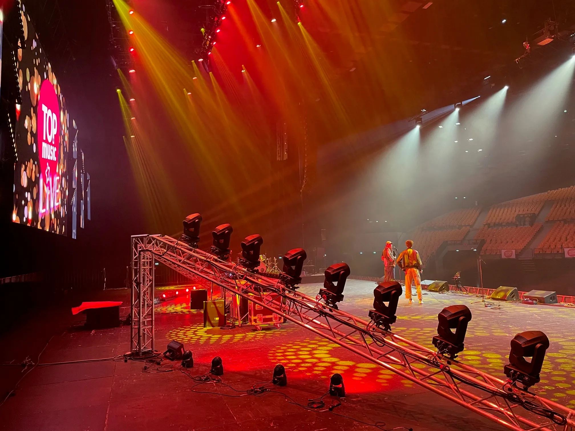 Après 30 heures de montage, les 25 techniciens son / lumière / vidéo de Xeos ont finalisé la scène du Top Music Live. Le plateau multicam est en place avec six caméras. Il y a aussi 100 projecteurs, 60 m2 d'écran led, 12 micros pour les chanteurs et les animateurs et 2x11 mètres de line-array (les grandes enceintes des deux côtés de la scène).